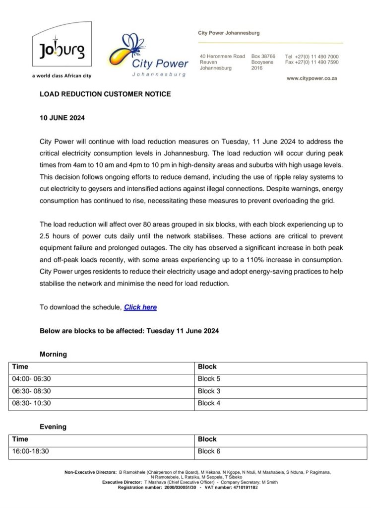 Johannesburg’s power unity City Power announced that it will be implementing load reduction due to the critical electricity consumption rate in the metro. This will occur during peak times, 4am – 10am , and 4pm – 10pm. They are implementing this due to the demand which is currently higher than the capacity of their supply systems.