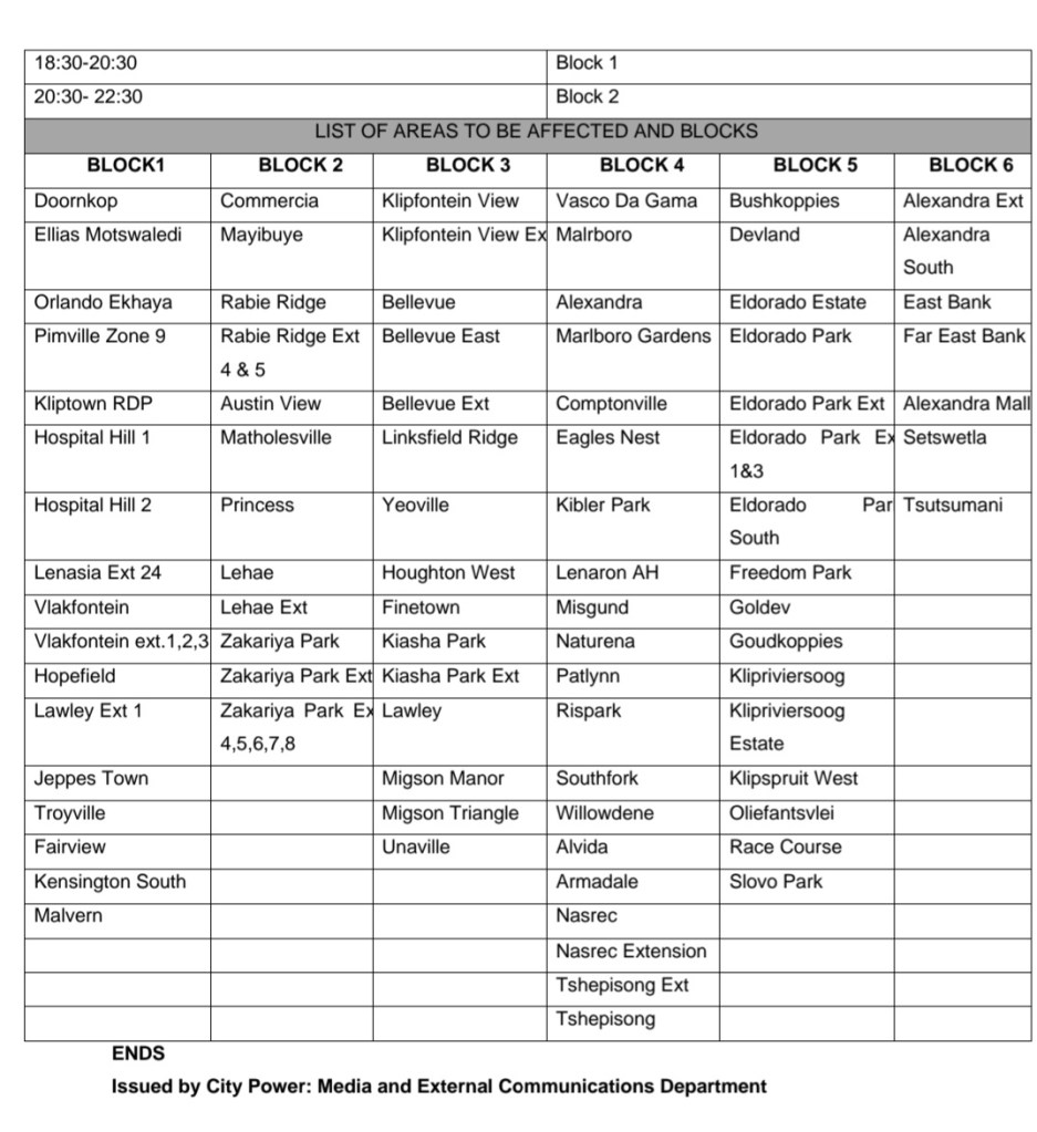 The whole city will not be in darkness. City Power has identified 80 areas that seemingly have had high electricity consumption rates.